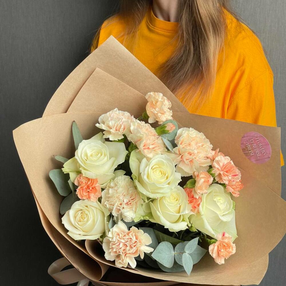 Роза – 5 шт. Упаковка – 1 шт. Диантус – 5 шт. Атласная лента – 1 шт. Диантус кустовой – 3 шт.