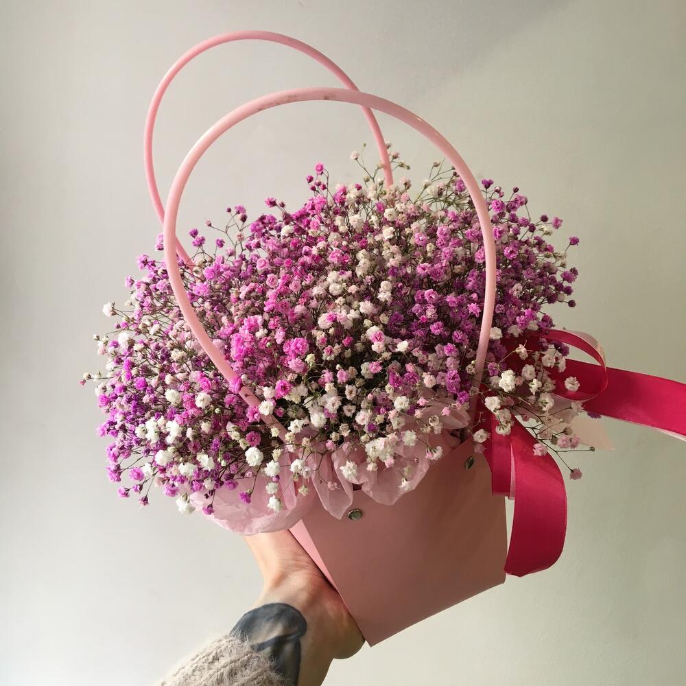 гипсофилы цветные – 6 шт.Оазис флористический – 1 шт.тишью розовое – 1 шт.Сумочка – 1 шт.Лента атласная – 2 шт.