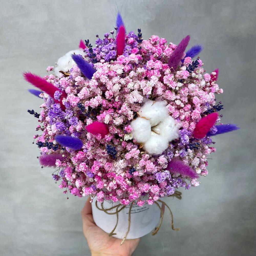 Хлопок – 3 шт. Коробка шляпная – 1 шт. Лагурус – 10 шт. Оазис флористический – 1 шт. гипсофила цветная – 7 шт.