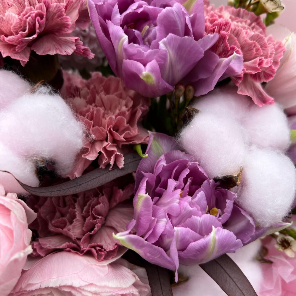 Букет из ранункулюсов, тюльпанов и диантусов «Лавандовая нежность»