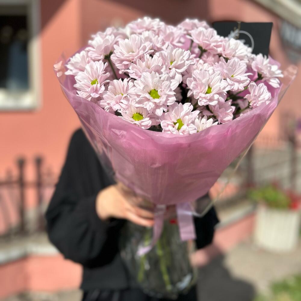 Букет из 5 веток ромашковой хризантемы в дизайнерском оформлении , количество ромашек в букете может достигать 51 шт.