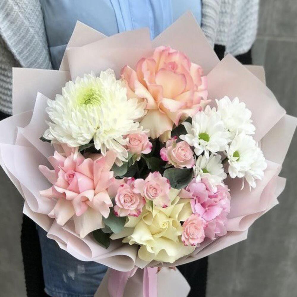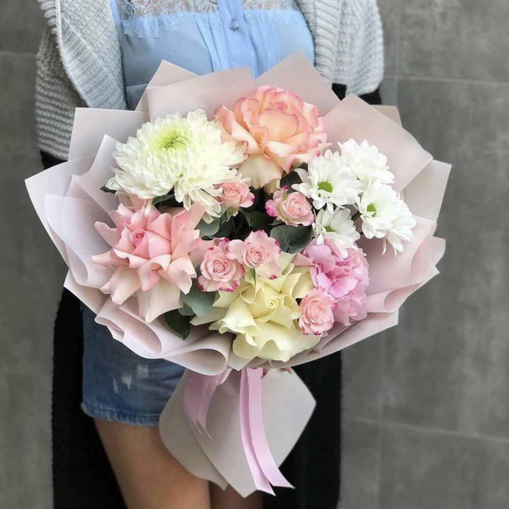 Альстромерии, Гортензии, Кустовые розы, Лизиантусы, Розы, Хризантемы