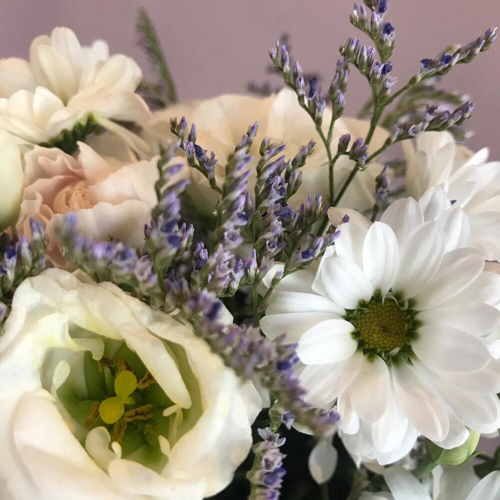«Лавандовое созвездие» Букет из розы, гвоздики, статица и хлопка