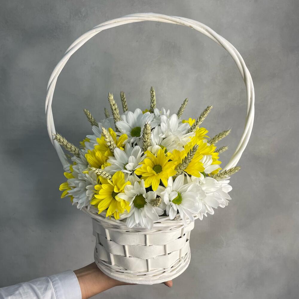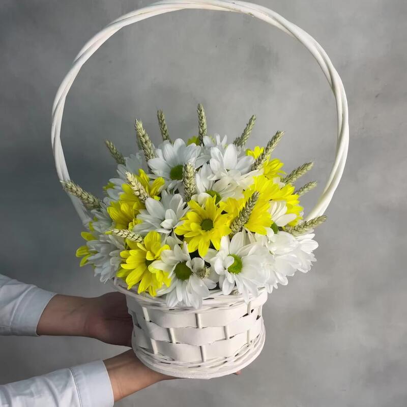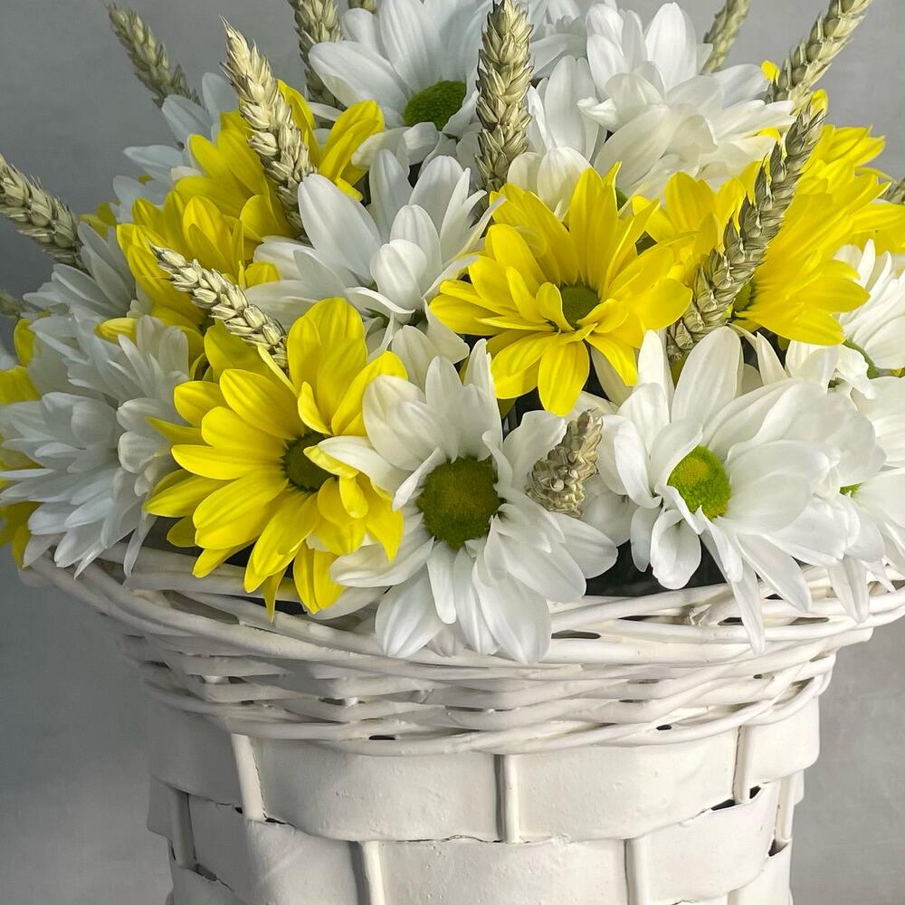 Корзина ротанговая – 1 шт.Оазис – 3 шт.Хризантема Кустовая Бакарди белая – 7 шт.хризантема кустовая селебрейт – 8 шт.Пшеница (сухоцвет) – 20 шт.