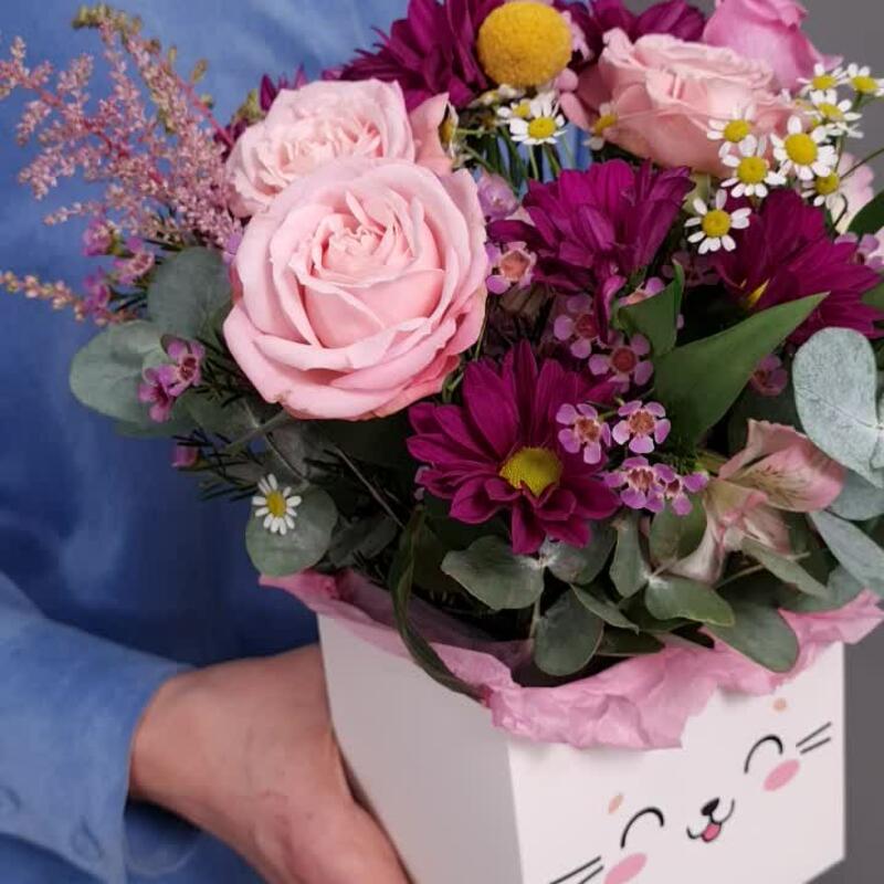 Альстромерия – 1 шт.Астильба – 3 шт.Ваксфлауэр – 1 шт.Краспедия – 1 шт.Хризантема кустовая – 1 шт.Эвкалипт – 2 шт.Эустома – 1 шт.Ромашка кустовая – 1 шт.Коробка – 1 шт.губка флористическая с водой – 1 шт.
