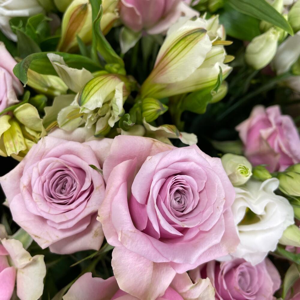 Роза кустовая – 9 шт.эустома белая – 5 шт.Альстромерия – 5 шт.Крафт упаковка – 5 шт.