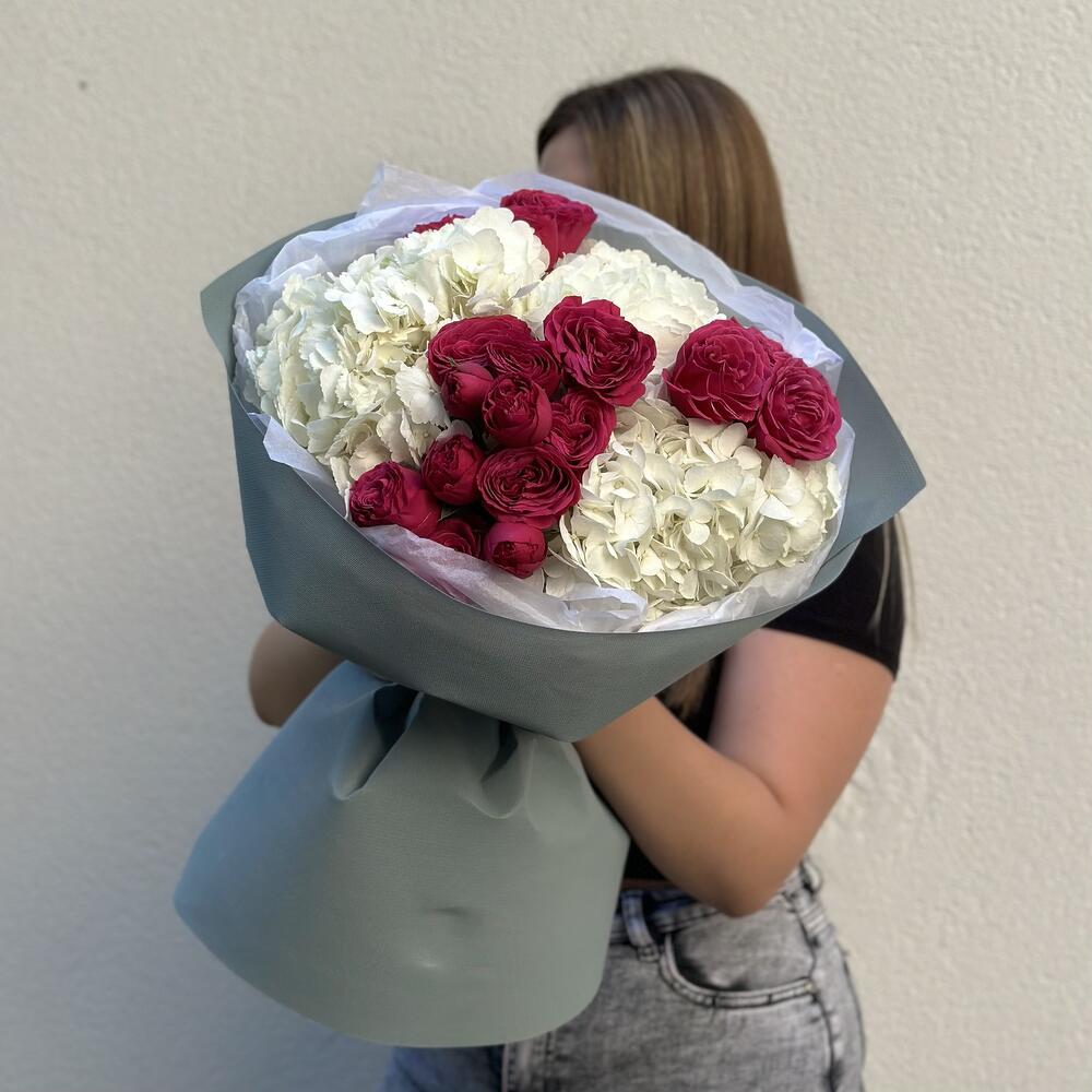 11 кустовых пионовидных роз + эвкалипт