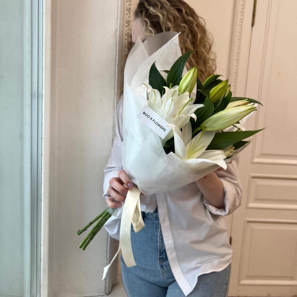 Лилия – 3 шт.Лента атласная – 1 шт.Дизайнерская упаковка – 1 шт.