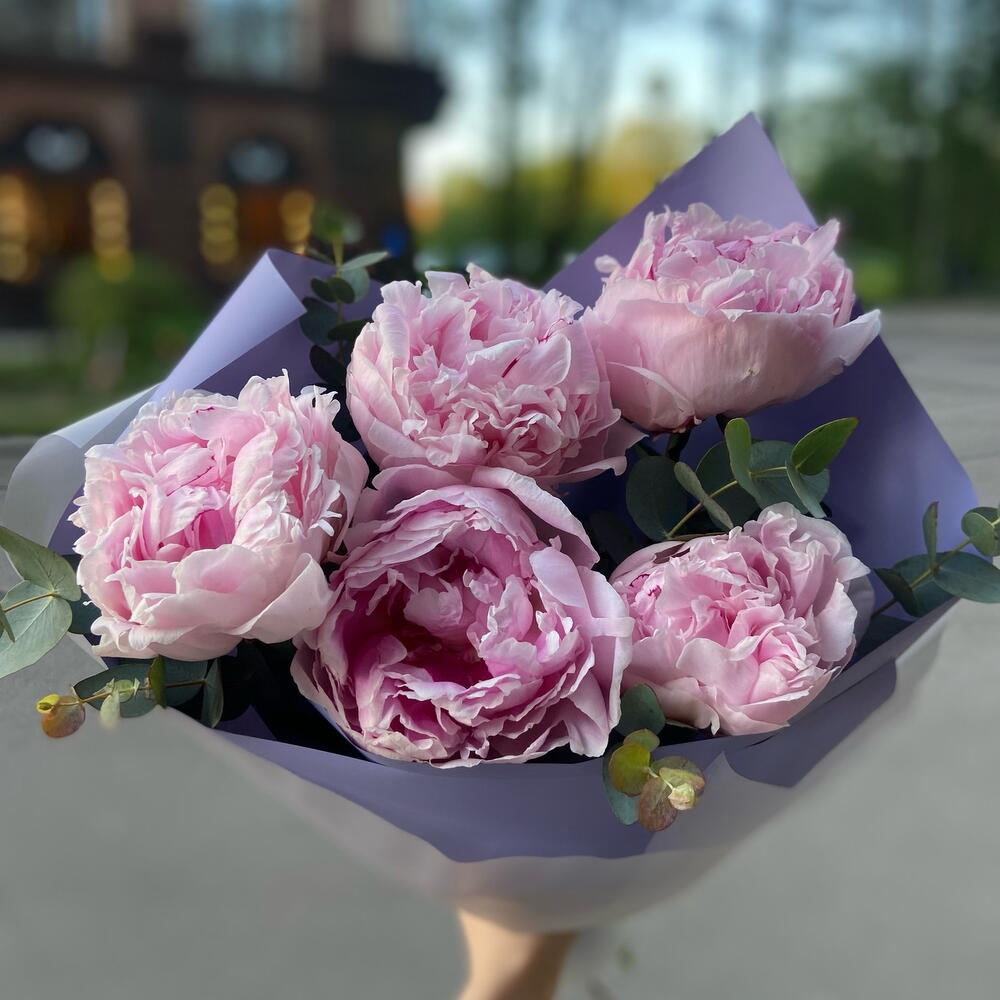 Букет из 5 пионов с эвкалиптом