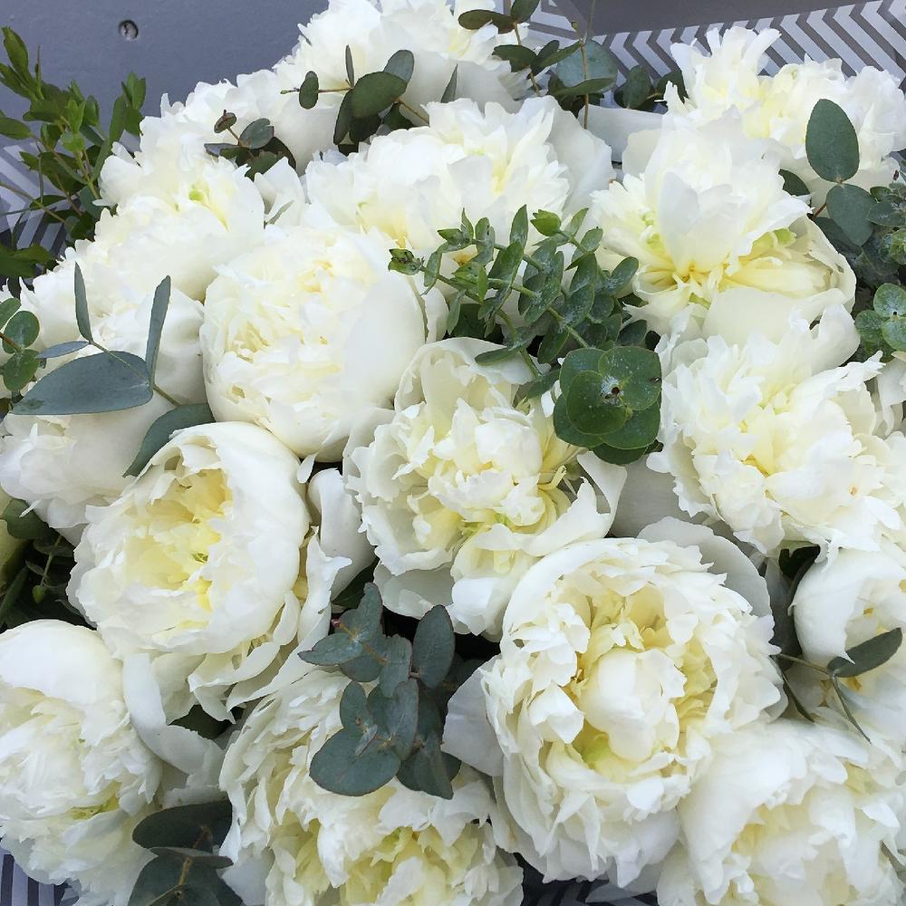 Роскошный букет из 19 белых пионов, с веточками ароматного эвкалипта, в лаконичной упаковке.Стильное цветочное решение длялюбого случая.Ширина букета около 70 сантиметров, высота букета около 70 сантиметров.