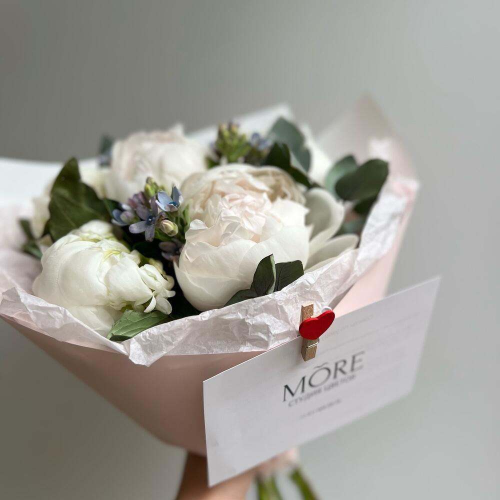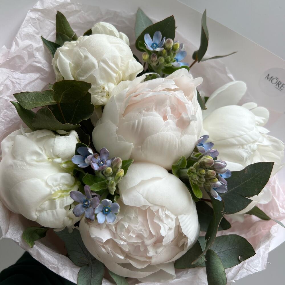 Пион – 5 шт.Оксипеталум – 3 шт.Эвкалипт – 6 шт.