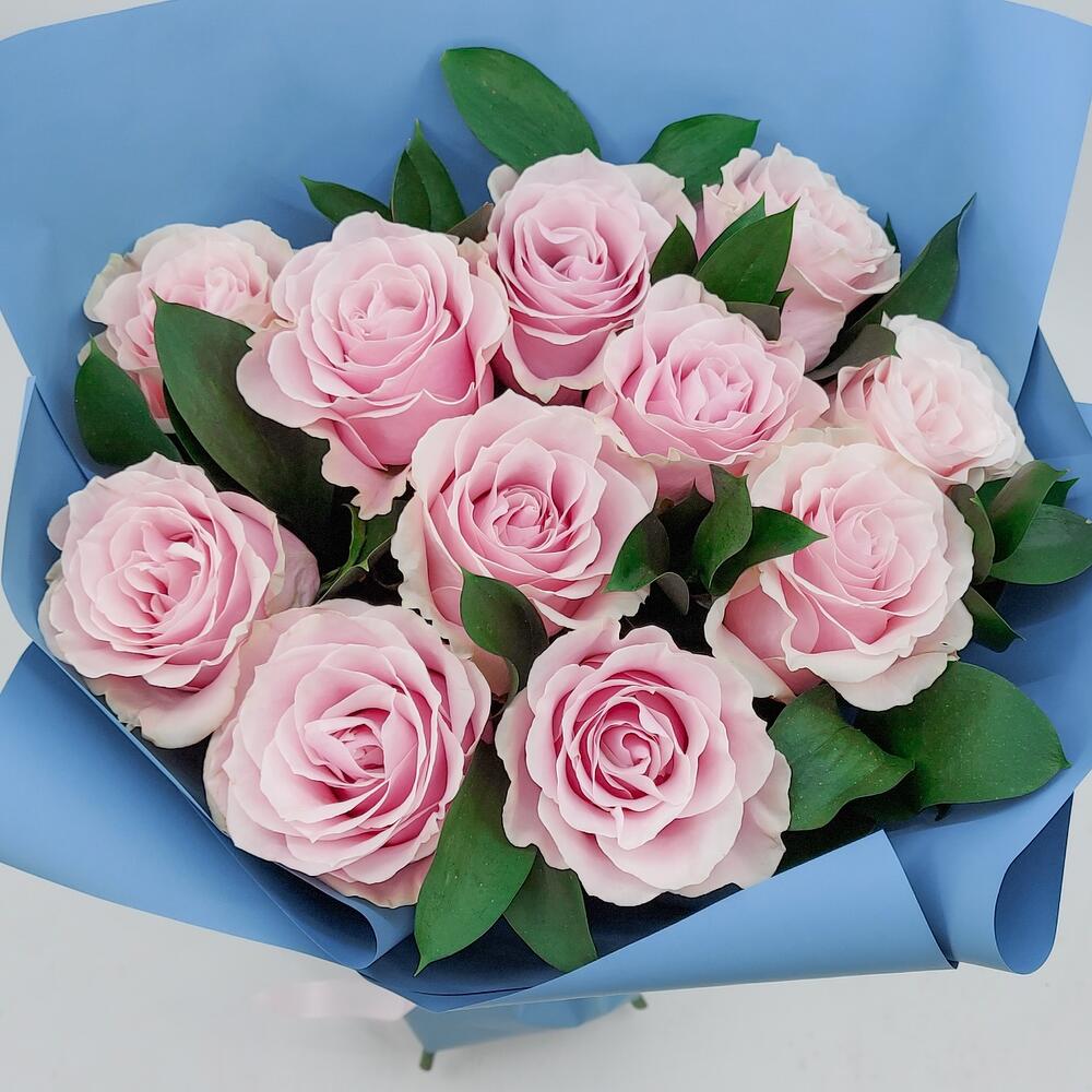 11 нежно-розовых роз с зеленью