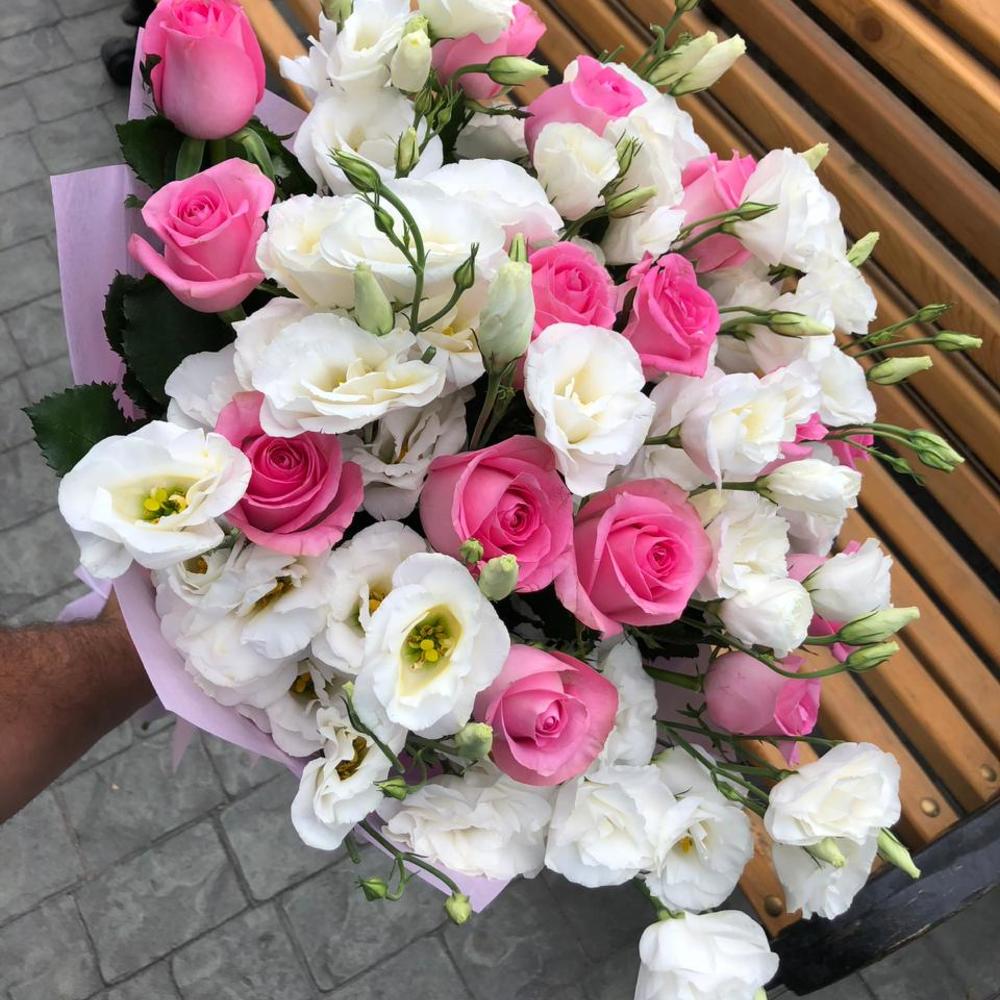 Белые эустомы с розовыми розами