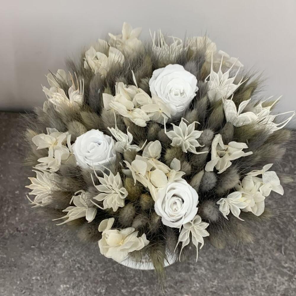 Кашпо керамическое – 1 шт.Роза стабилизированная – 3 шт.гортензия стабилизированная – 1 шт.лагурус пучок – 2 шт.Нигелла сухоцвет – 15 шт.