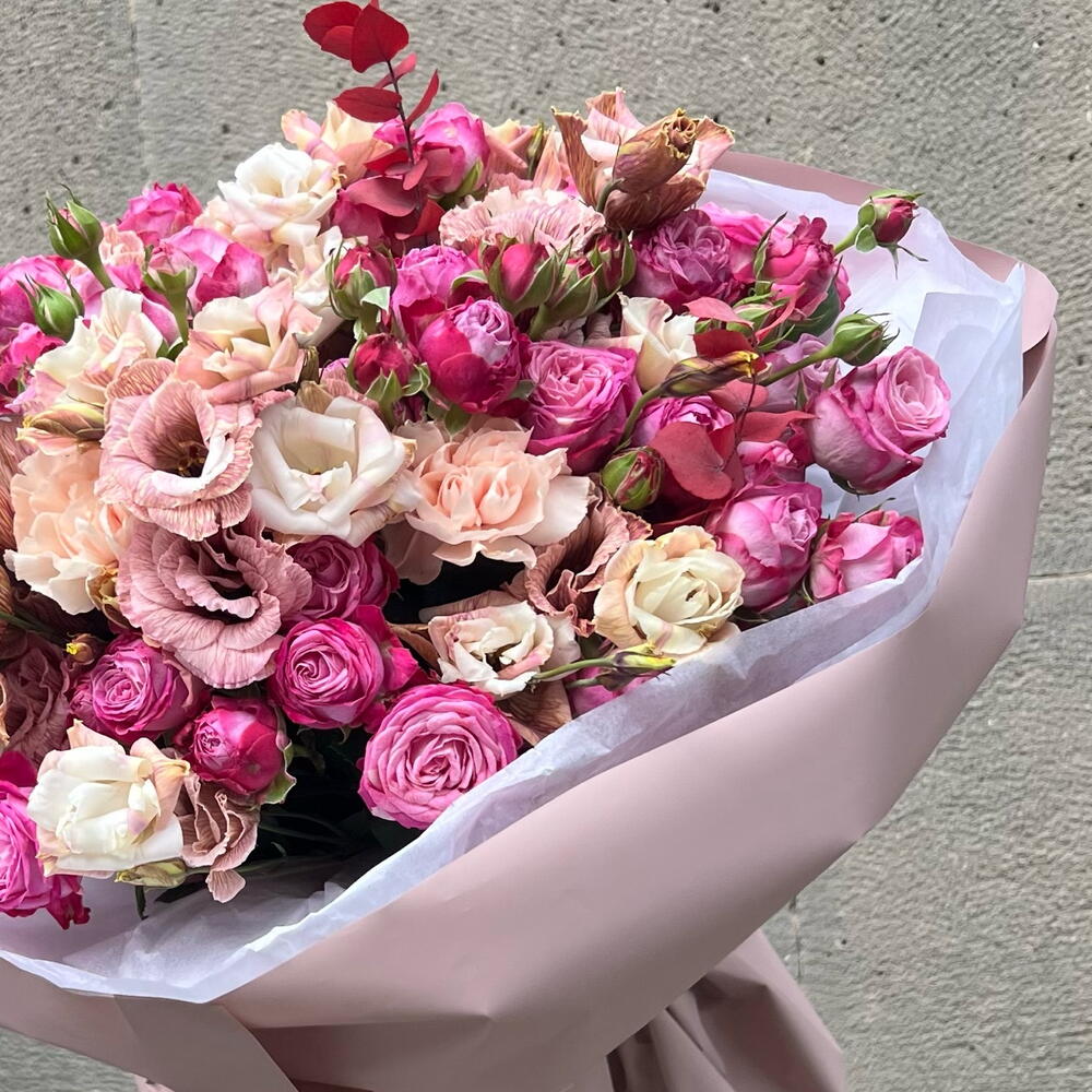 Альстромерии, Гвоздики, Кустовые розы, Лизиантусы, Розы, Хризантемы