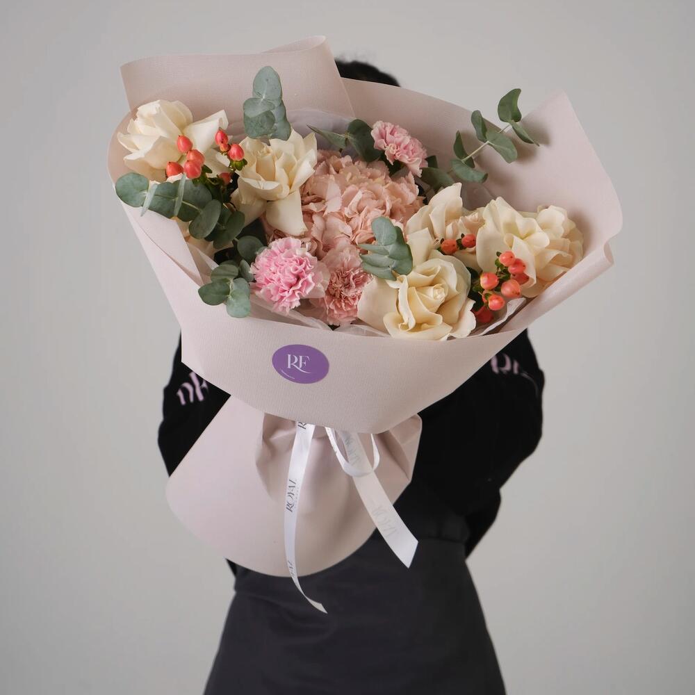 Гвоздики, Пионовидные розы, Розы