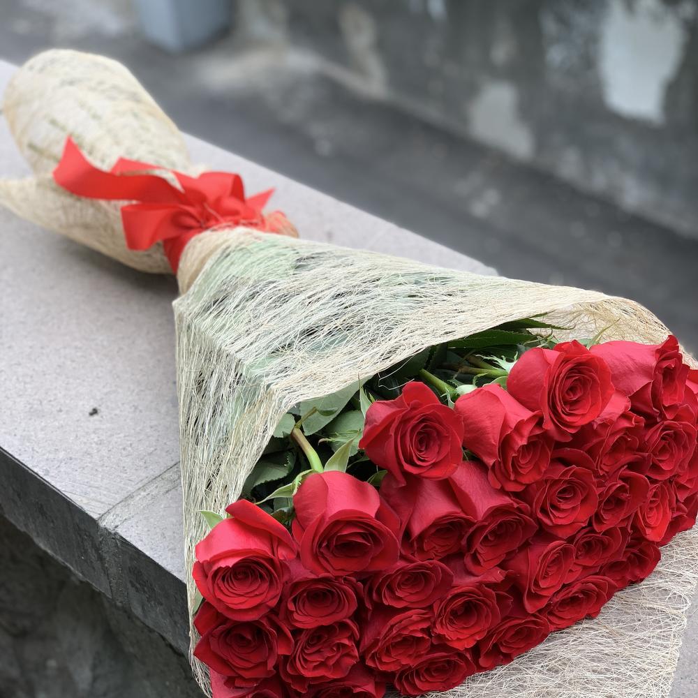 Букет высоких метровых роз стильно оформленный в элитную упаковку сизаль.