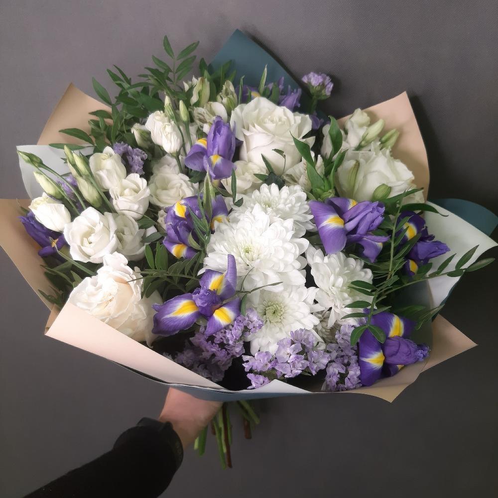 Роза Эквадор – 3 шт.Ирис Blue Magic – 6 шт.Лизиантус – 2 шт.Хризантема кустовая – 2 шт.Зелень – 5 шт.Упаковка дизайнерская – 3 шт.