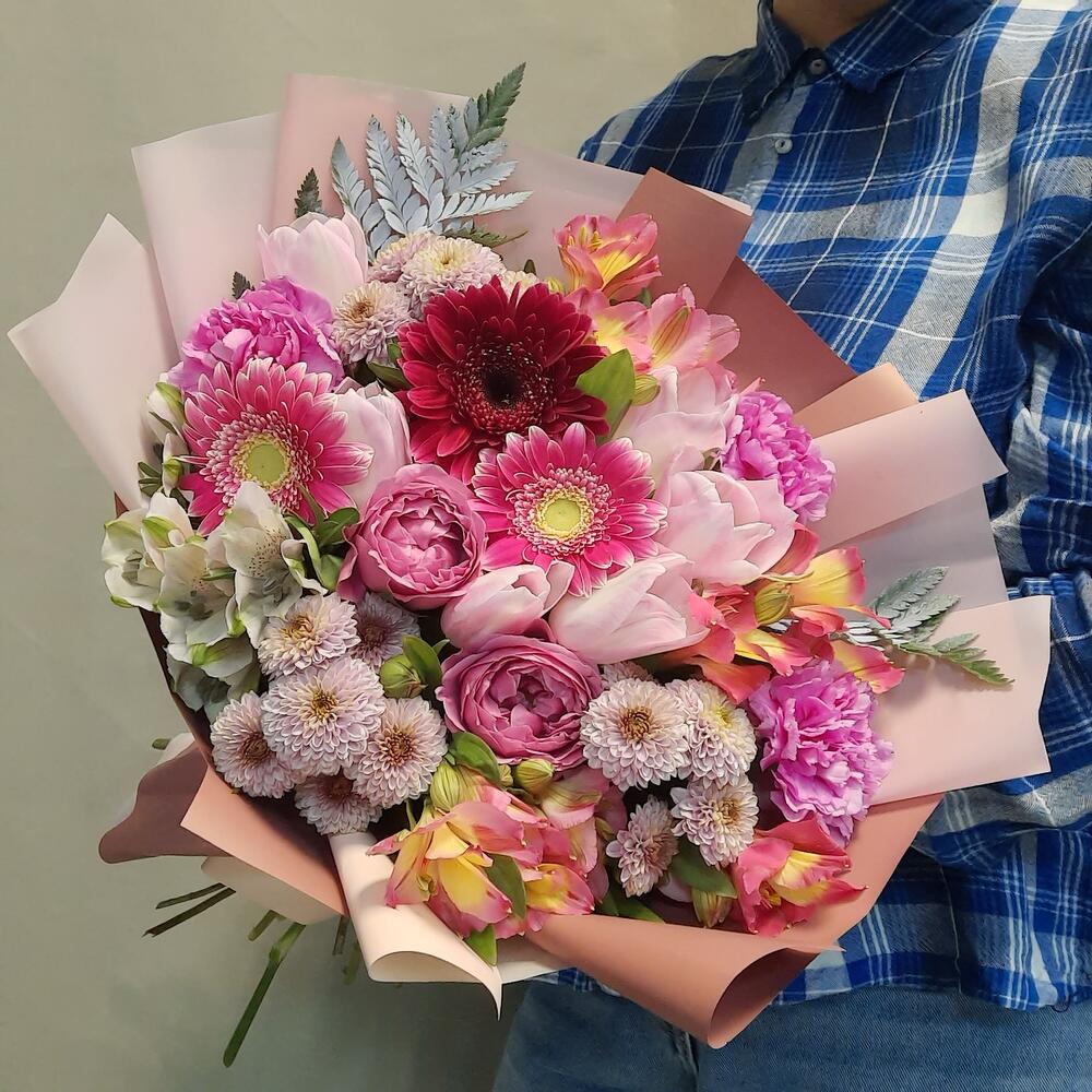 Гермини – 3 шт.Роза кустовая пионовидная – 1 шт.Диантус – 3 шт.Альстромерия – 4 шт.Сантини – 3 шт.Тюльпан – 6 шт.Папоротник – 2 шт.Рускус – 12 шт.Упаковка дизайнерская – 2 шт.Лента атласная – 1 шт.