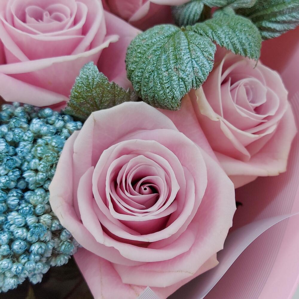 Гортензия – 1 шт.Озотамнус – 1 шт.Роза Эквадор – 5 шт.Упаковка дизайнерская – 1 шт.рубус зелень – 5 шт.
