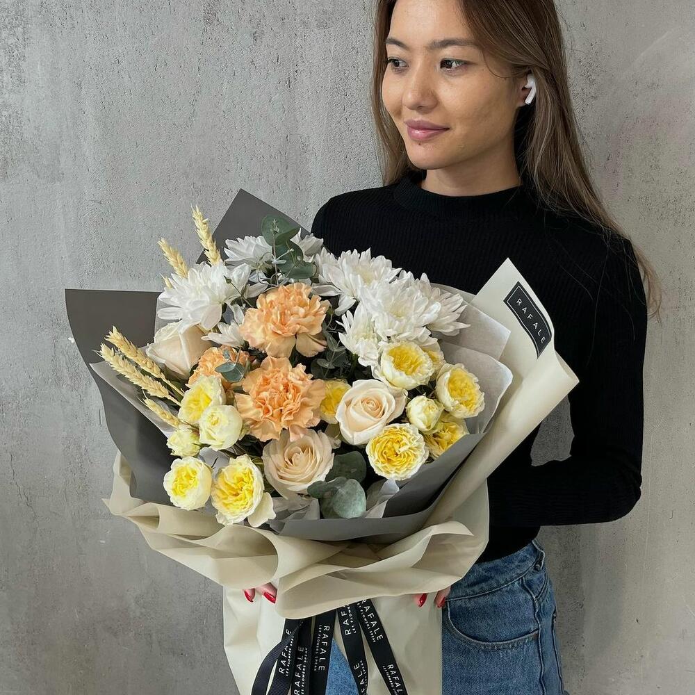 Альстромерии, Гвоздики, Кустовые розы, Лизиантусы, Розы, Хризантемы