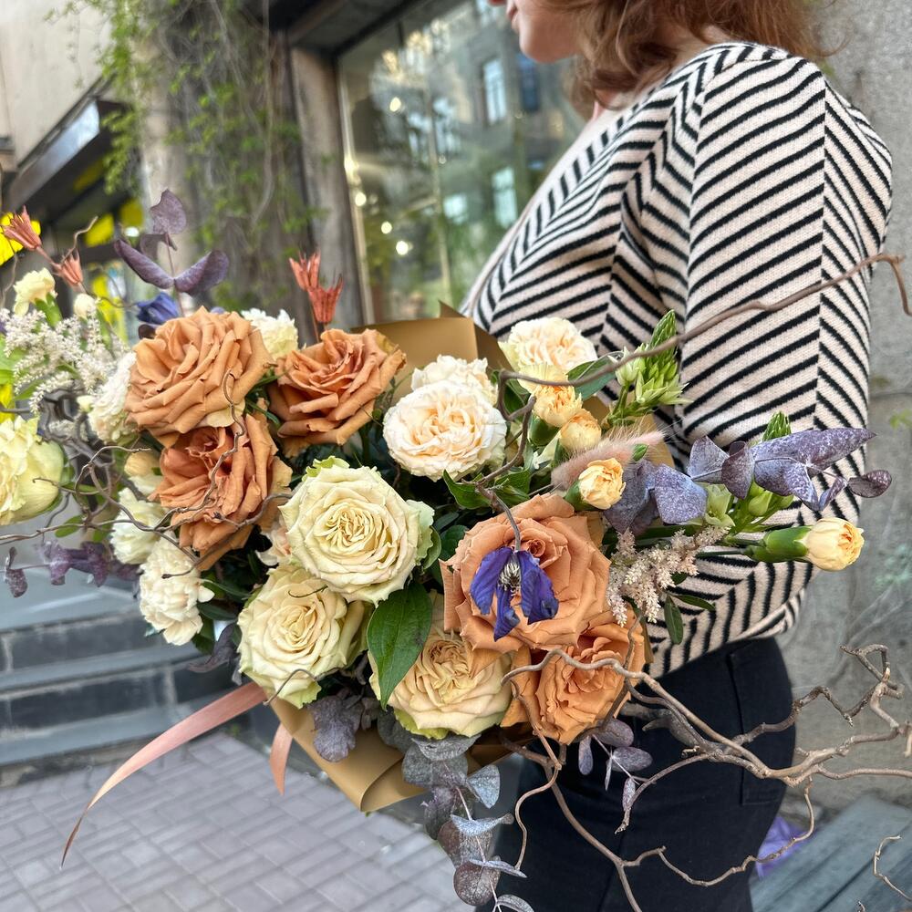 Астильба – 2 шт.Эвкалипт – 4 шт.Диантус – 7 шт.Орнитогалум – 2 шт.Роза пионовидная – 4 шт.Сухоцветы – 10 шт.Клематис – 2 шт.Роза кустовая пионовидная – 2 шт.Корилус – 2 шт.Роза шоколадная – 5 шт.Дизайнерская упаковка – 2 шт.атласный бант – 1 шт.