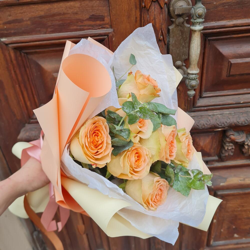 Роза пионовидная – 7 шт.Эвкалипт Baby Blue – 3 шт.