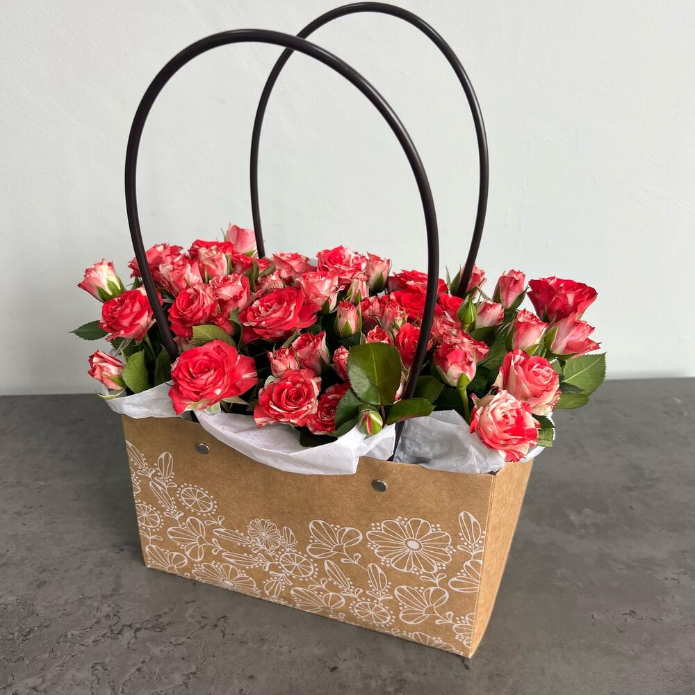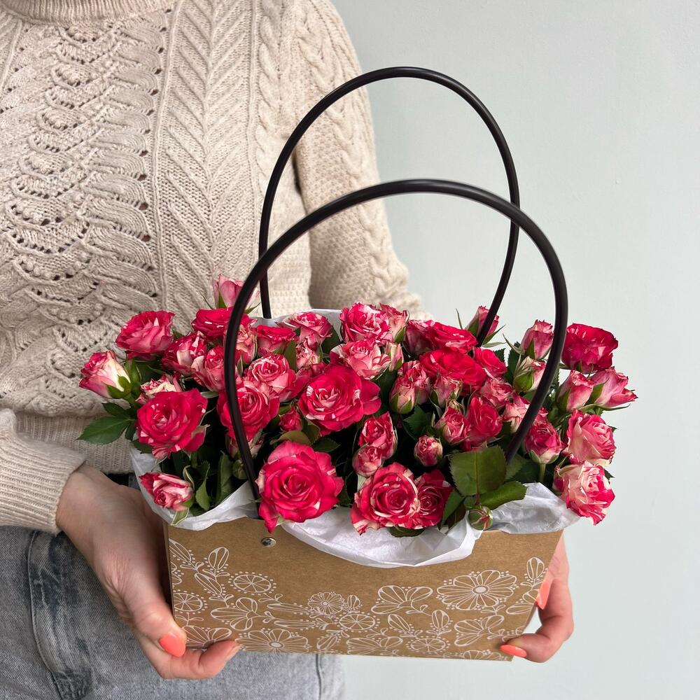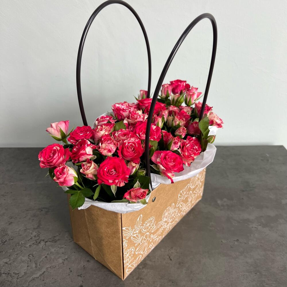 Кустовая роза – 3 шт.Оазис – 1 шт.Коробка – 1 шт.Тишью белое – 1 шт.