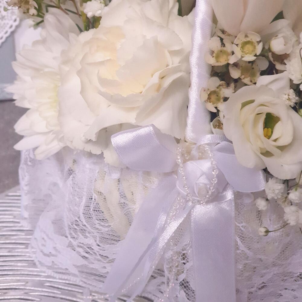 Эвкалипт – 1 шт.Хризантема кустовая белая – 2 шт.Лизиантус Алиса белый – 2 шт.Хамелациум белый – 1 шт.Альстромерия белая или розовая – 1 шт.гипсофила белая – 1 шт.роза пионовидная Дэвид остина – 3 шт.диантус белый сортовой – 3 шт.