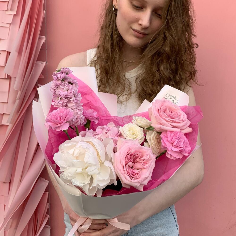 Гортензия – 1 шт.Маттиола – 1 шт.Гвоздика – 3 шт.Роза – 3 шт.Пион – 1 шт.Упаковка дизайнерская – 1 шт.