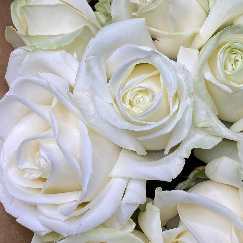 Роза белая одноголовая – 19 шт.Крафт дизайнерский – 1 шт.Лента атласная – 1 шт.