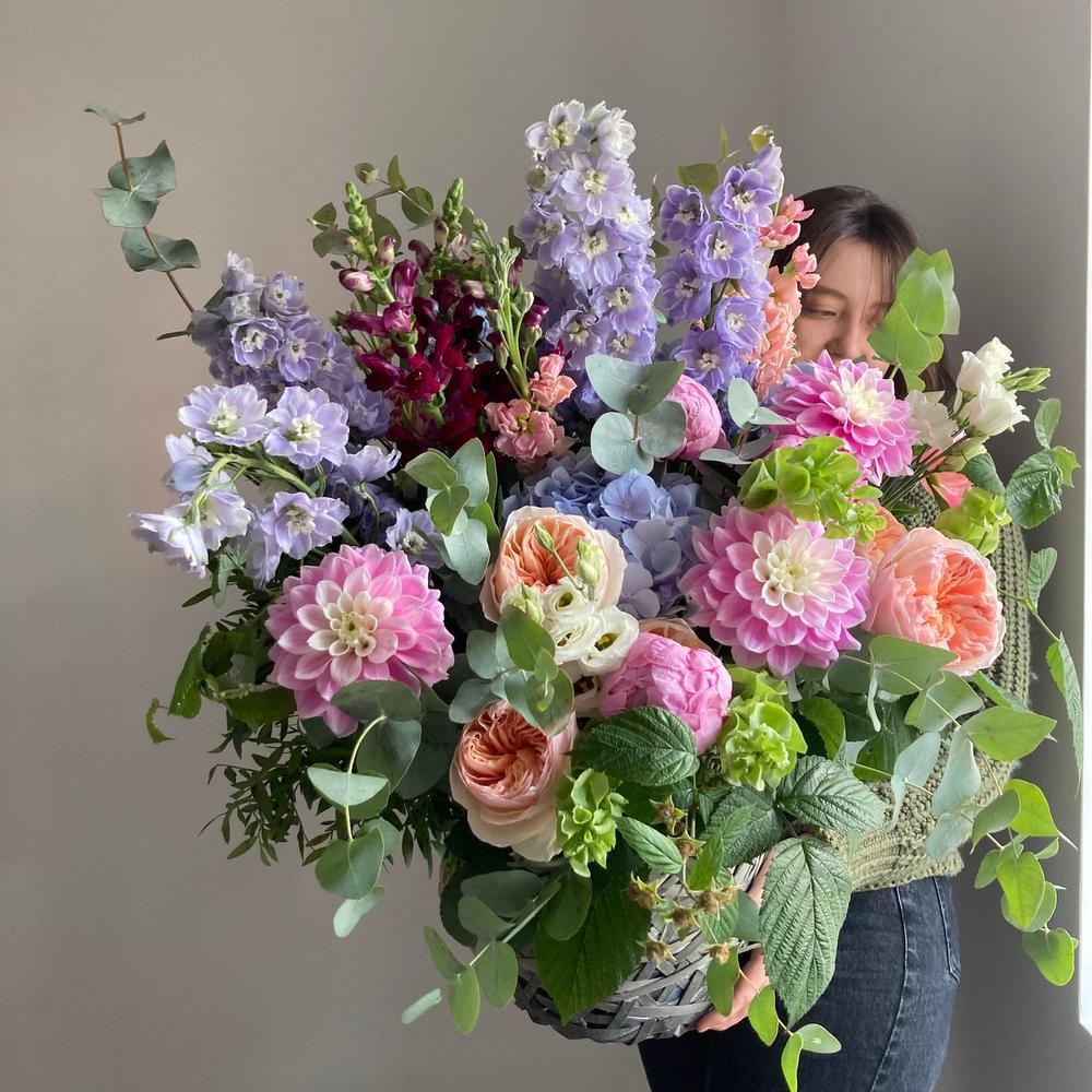 Душистая, садовая корзина с дельфиниумом, георгинами, гортензиями, пионовидными розами, маттиолой, львиным зевом, ирландскими колокольчиками, малиной и эвкалиптом.