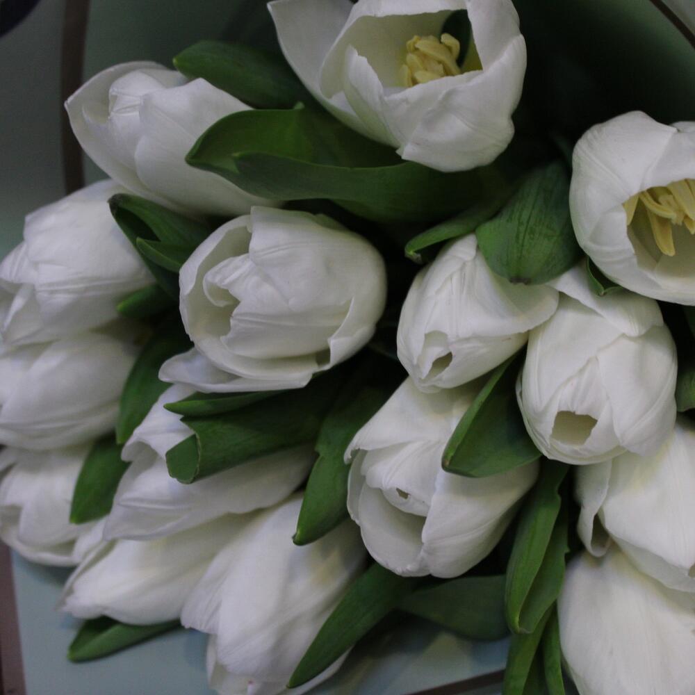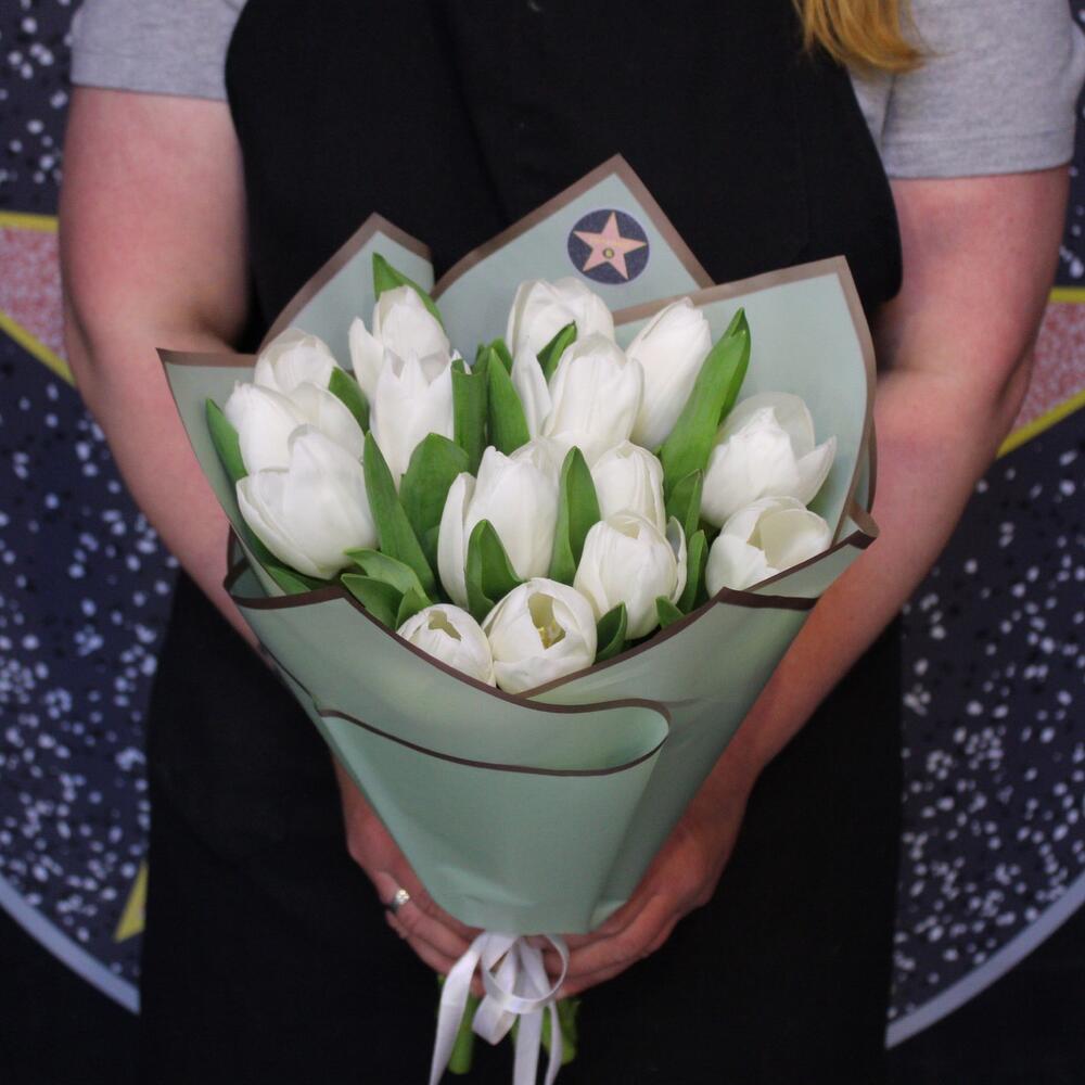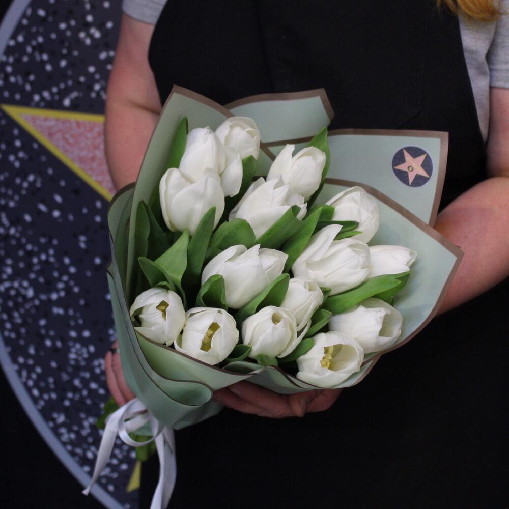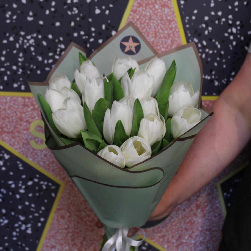 Лента атласная – 1 шт.Тюльпан белый (голландия) – 15 шт.Пленка дизайнерская – 2 шт.