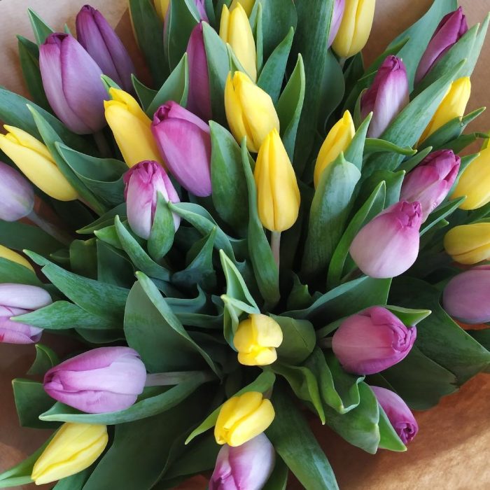 37 тюльпаны МИКС в модной крафт бумаге смотрятся очень красиво и достойно. Нет человека, который не знает, что такое тюльпаны. Яркие и нежные, они появляются на наших рынках с приходом весны. Сейчас известно две с половиной тысячи видов этих цветов. Богатая палитра расцветок … Показать ещёих лепестков поражает разнообразием оттенков. Отвечая на вопрос о том, какого цвета бывают тюльпаны, можно сказать, что любого. От белого до черного и от голубого до темно-фиолетового. Выбирая букет, большинство из нас руководствуется внешним видом бутонов и мало внимания обращает на цвет лепестков. А ведь каждый таит в себе определенное значение. Значительно проще выбрать букет тюльпанов разноцветных, он красивый, пестрый и ни к чему не обязывающий.